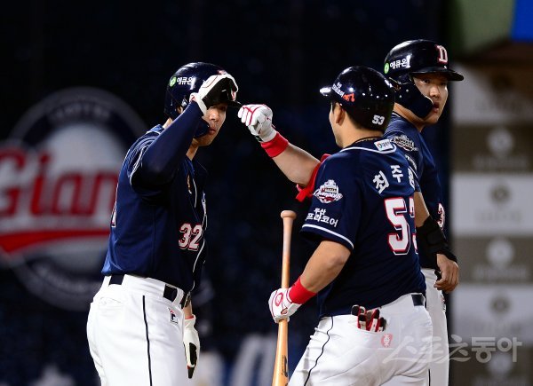 7회초 1사 1, 2루에서 두산 대타 최주환이 역전 3점 홈런을 날린 뒤 동료들의 환영을 받고 있다.