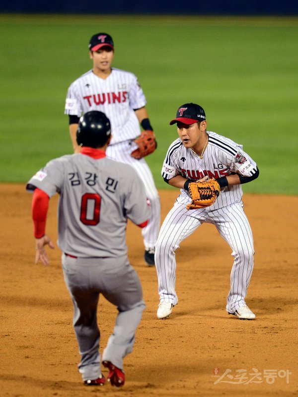 9회초 1사 1루 LG 정주현이 땅볼 타구를 잡아 1루주자를 아웃시키고 있다.