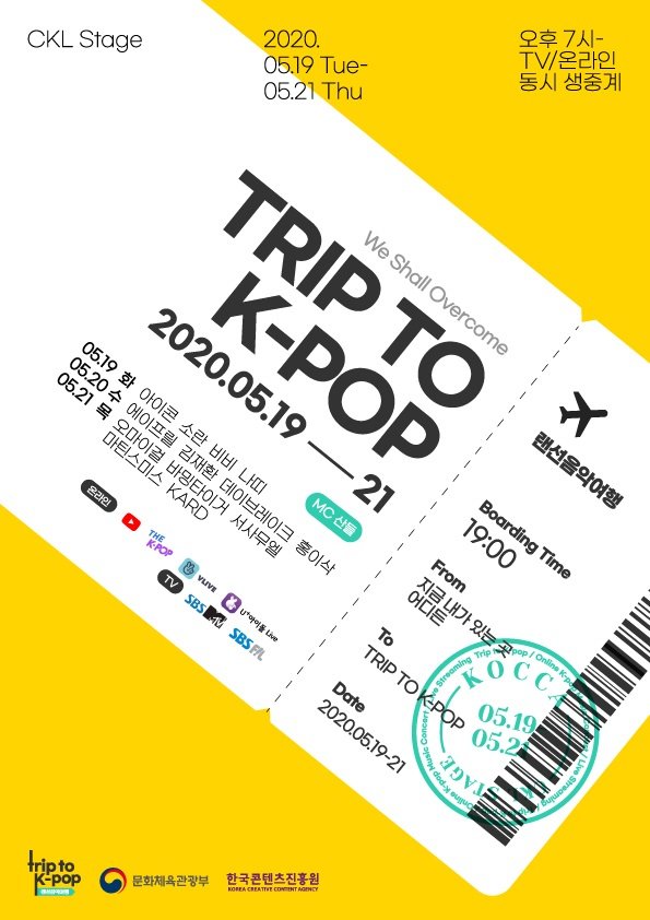 ‘랜선음악여행-트립 투 케이팝’은 K-POP 아이돌을 비롯한 한국 뮤지션들이 코로나 19로 힘들어하는 세계인을 위로하고 응원하기 위한 공연. 코로나 19로 인해 ‘집콕’에 답답해 하는 세계인들에게 ‘한국으로의 랜선 음악 여행’을 제안하는 동시에 ‘우리는 이길 수 있다’(We shall overcome)이라는 부제에 맞춰 다 함께 어려움을 극복하자는 응원의 메시지를 전할 예정이다.