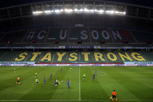 K리그는 코로나19로 타격을 받은 세계축구계에 새로운 표준을 제시하고 있다. 10일 열린 K리그2 충남아산-부천FC전에선 부천 외국인 공격수 바이아노가 그라운드에 넘어졌다가 일어나는 과정에서 주심에게 손을 내밀었지만 ‘외면’을 받았다. 무관중 경기(사진)와 더불어 코로나19가 바꾼 축구장의 새로운 풍경이다. 사진제공|한국프로축구연맹