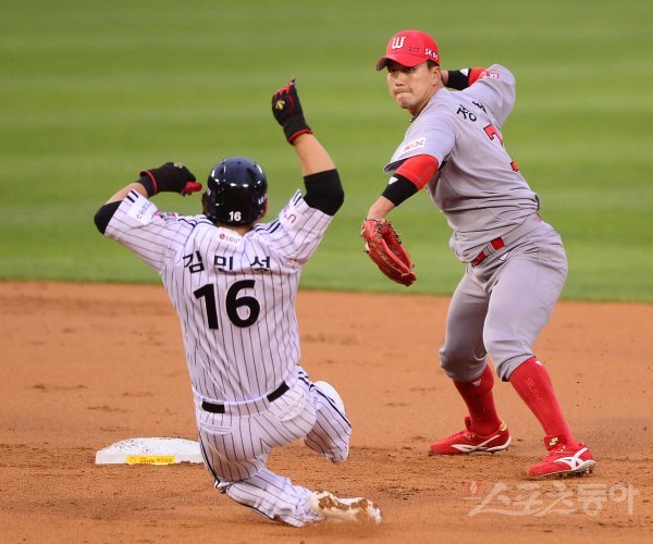 2회말 무사 1, 2루 LG 박용택의 내야 땅볼 때 SK 정현이 1루주자를 포스 아웃시킨 뒤 1루로 송구하고 있다.
