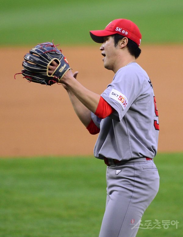 1회말 수비를 마친 뒤 SK 박종훈이 기뻐하고 있다.