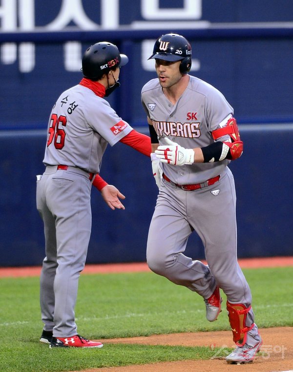 2회초 무사 SK 로맥이 선제 솔로포를 날린 뒤 3루코치와 기쁨을 나누고 있다.