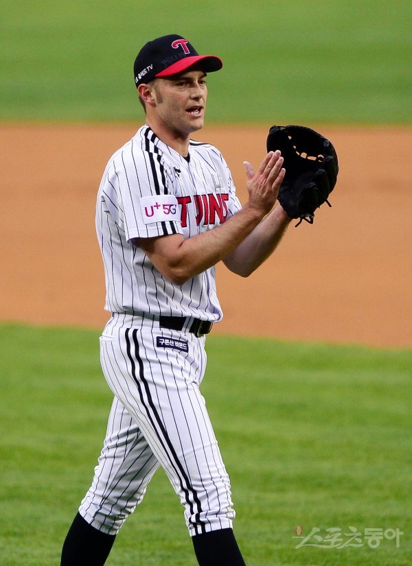 1회초 수비를 마친 뒤 LG 윌슨이 기뻐하고 있다.