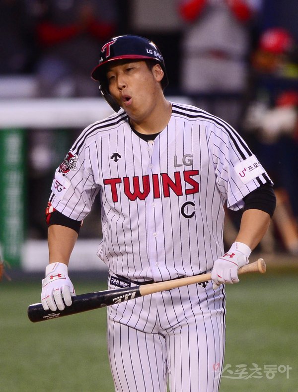 3회말 1사 LG 김현수가 삼진 아웃당한 뒤 아쉬워하고 있다.
