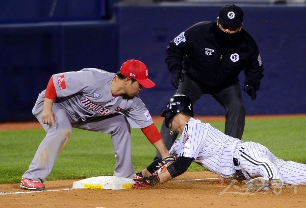 5회말 2사 2루 상황에서 SK 최정이 LG 2루주자의 도루를 저지하고 있다.