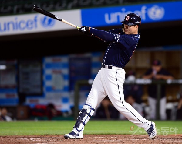 5회초 2사 2루에서 두산 오재일이 1타점 적시타를 날리고 있다.