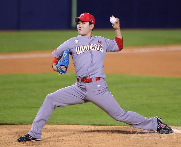 6회말 교체 등판한 SK 김정빈이 역투하고 있다.