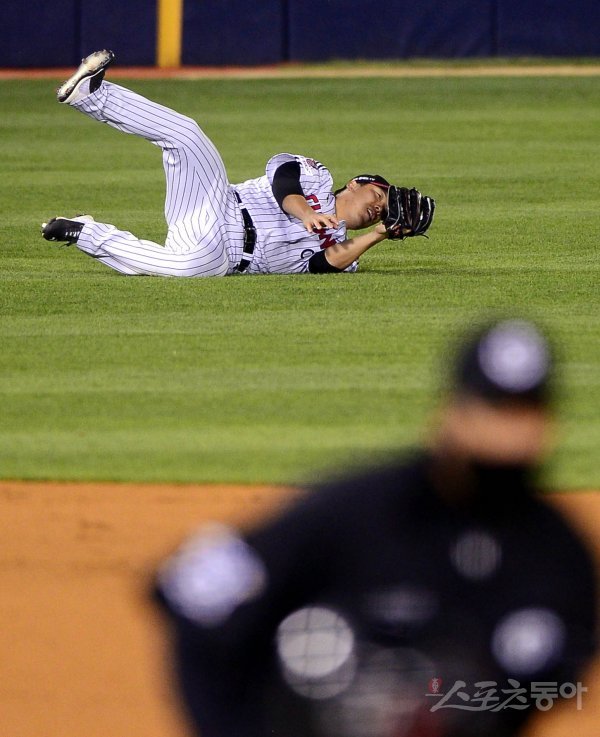 6회초 2사 상황에서 LG 김현수가 외야 수비를 펼친 뒤 글러브를 바라보고 있다.