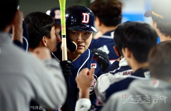 7회초 1사 3루에서 두산 오재일이 투런 홈런을 날린 뒤 동료들의 환영을 받고 있다.