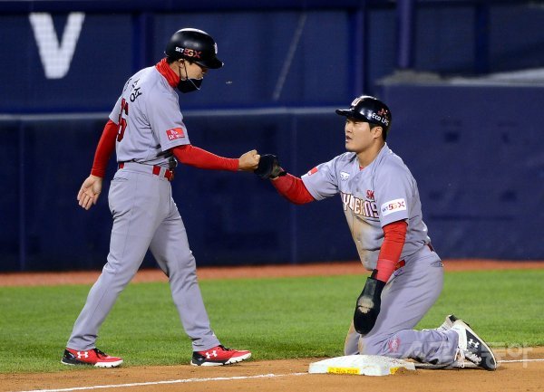 8회초 1사 3루 상황에서 SK 2루주자 정진기가 투수의 폭투를 틈 타 3루로 진루해 3루코치와 주먹을 맞대고 있다.