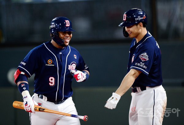 8회초 2사에서 두산 페르난데스가 솔로 홈런을 쏘아 올린 뒤 김재환의 환영을 받고 있다.