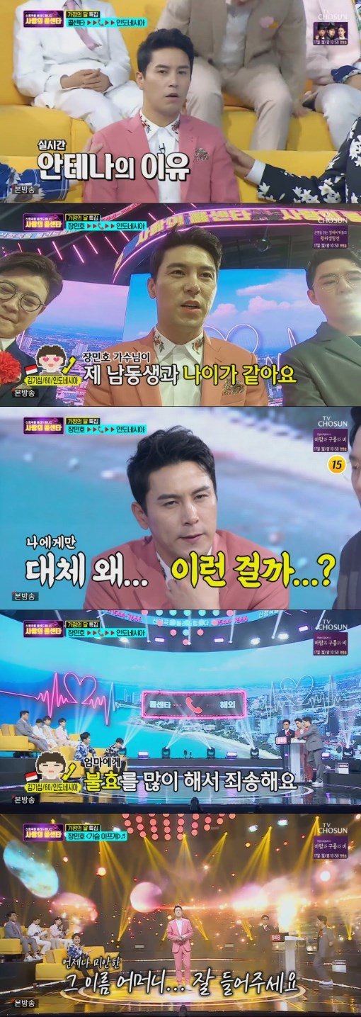 이에 장민호는 팬과 대화를 나누고 있었다. 그런데 전화 연결이 끊기고 말았다. 유난히 장민호에게 이런 일이 자주 있어 그는 “왜 나 할 때만 이러냐”라고 속상해했다. 하지만 전화연결이 다시 됐고 인도네시아에서 사는 팬은 남진의 ‘가슴 아프게’를 신청했다.
