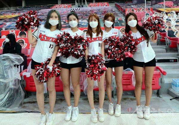 코로나19 여파로 무관중으로 경기가 열리는 가운데 kt 치어리더가 카메라를 향해 포즈를 취하고 있다.