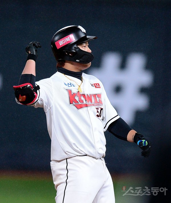 5회말 1사 1, 3루에서 kt 강백호가 2타점 동점 2루타를 날린 뒤 환호하고 있다.