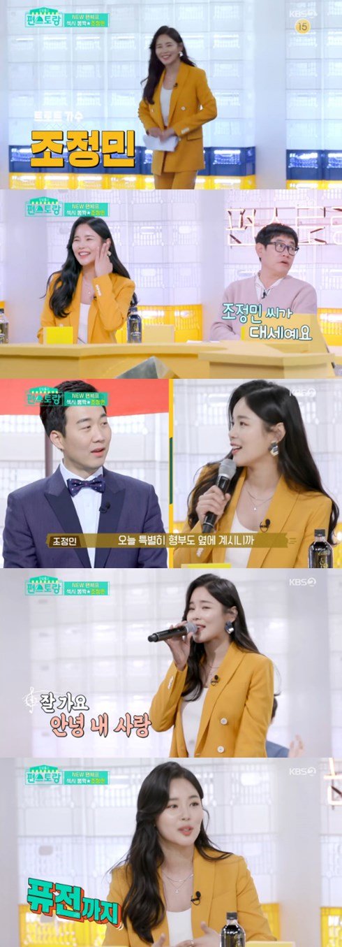 이영자는 “그래도 노래 한 번은 들어보자”라고 말했다. 조정민은 “형부가 계시니까 장윤정 선배의 ‘짠짠짠’을 부르겠다”라고 말하며 열창했다.