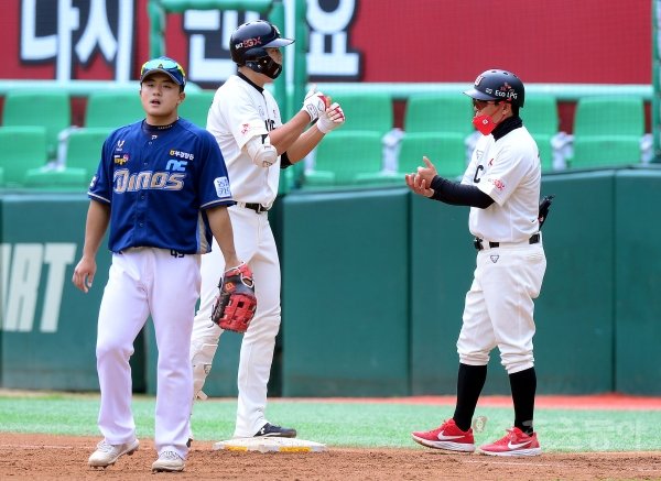 17일 인천 SK행복드림구장에서 ‘2020 신한은행 SOL KBO리그’ SK 와이번스와 NC 다이노스의 경기가 열렸다. 2회말 2사 1, 2루에서 SK 오준혁이 1타점 역전타를 날린 뒤 환호하고 있다.
