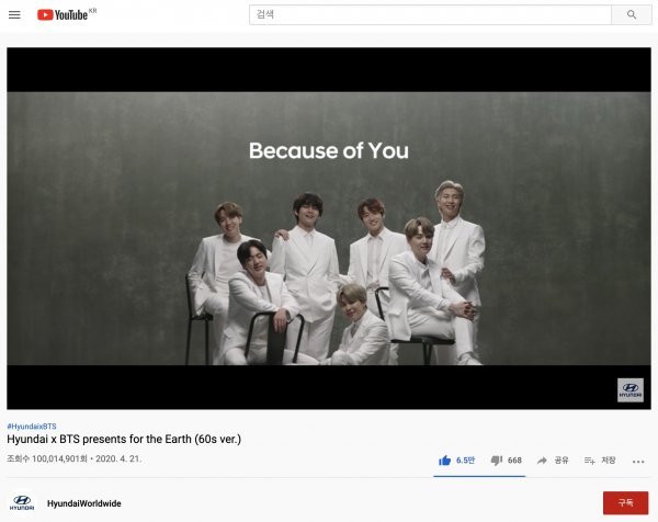 현대자동차가 지구의 날을 맞이해 선보인 방탄소년단과 함께하는 ‘글로벌 수소 캠페인’ 특별 영상이 27일 만에 조회 수 1억 회를 돌파했다고 19일 밝혔다.