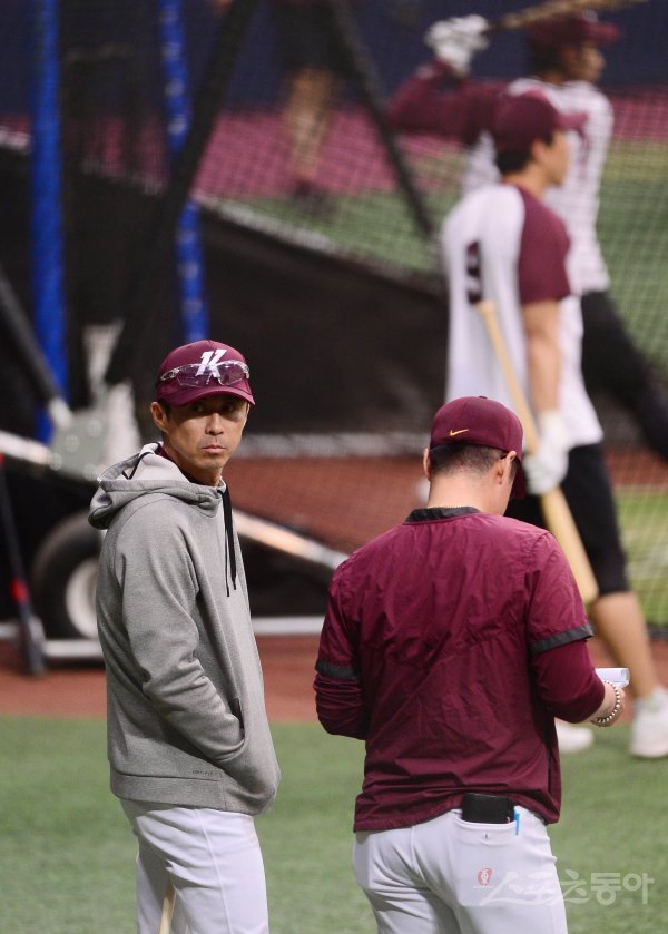 키움 손혁 감독이 경기에 앞서 진행된 훈련을 지켜보고 있다.