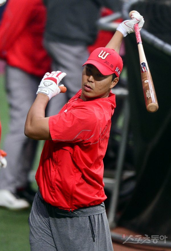 SK 한동민이 경기에 앞서 진행된 훈련에서 스윙 연습을 하고 있다.