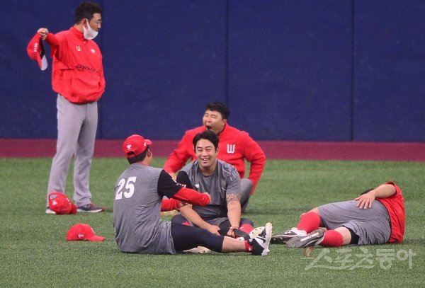 SK 선수들이 경기에 앞서 외야에서 몸을 풀고 있다.