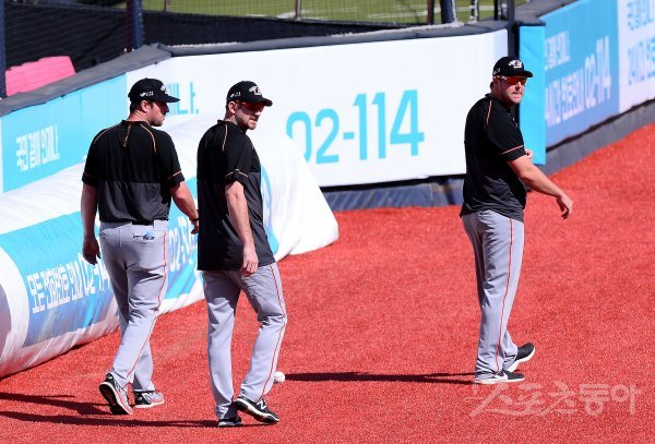 경기 전 한화 외국인 선수 채드벨, 호잉, 서폴드가 훈련을 위해 외야로 걸어가고 있다.