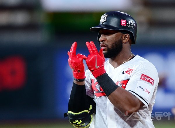 19일 경기도 수원 kt위즈파크에서 ‘2020 신한은행 SOL KBO리그’ kt 위즈와 한화 이글스의 경기가 열렸다. 3회말 무사 2루에서 kt 로하스가 1타점 적시타를 날린 뒤 세리머니를 펼치고 있다.