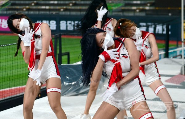 19일 경기도 수원 kt위즈파크에서 ‘2020 신한은행 SOL KBO리그’ kt 위즈와 한화 이글스의 경기가 열렸다. kt 치어리더가 화려한 공연을 선보이고 있다.