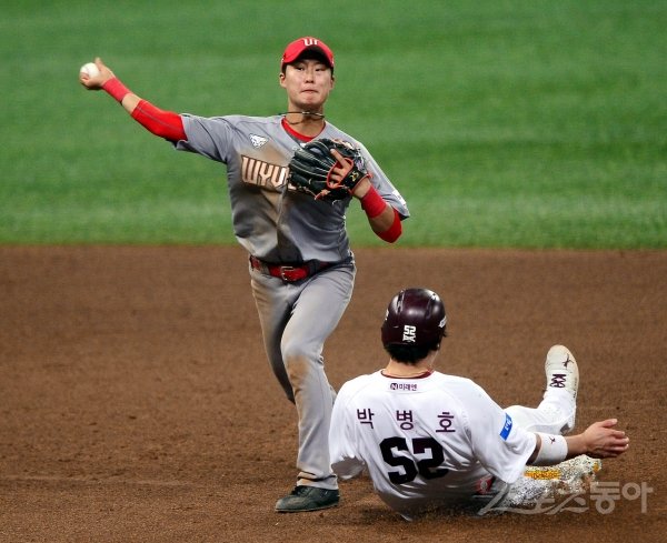 19일 서울 고척스카이돔에서 ‘2020 신한은행 SOL KBO리그’ 키움 히어로즈와 SK 와이번스의 경기가 열렸다. 4회말 1사 만루 키움 이택근의 내야 땅볼 때 SK 김창평이 1루주자를 포스 아웃시킨 뒤 1루로 송구하고 있다.