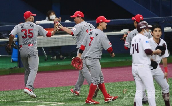19일 서울 고척스카이돔에서 ‘2020 신한은행 SOL KBO리그’ 키움 히어로즈와 SK 와이번스의 경기가 열렸다. 4회말 수비를 마친 SK 선수들이 기쁨을 나누고 있다.
