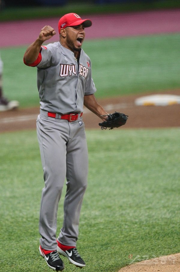 19일 서울 고척스카이돔에서 ‘2020 신한은행 SOL KBO리그’ 키움 히어로즈와 SK 와이번스의 경기가 열렸다. 4회말 1사 만루 SK 핀토가 만루 위기를 넘긴 뒤 환호하고 있다.