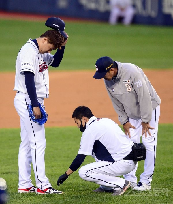 19일 서울 잠실야구장에서 ‘2020 신한은행 SOL KBO 리그’ NC 다이노스와 두산 베어스의 경기가 열렸다. 선발 투수로 등판한 두산 이영하가 1회초 1사 만루 상황에서 NC 이명기의 타구에 맞아 상태를 확인하고 있다.