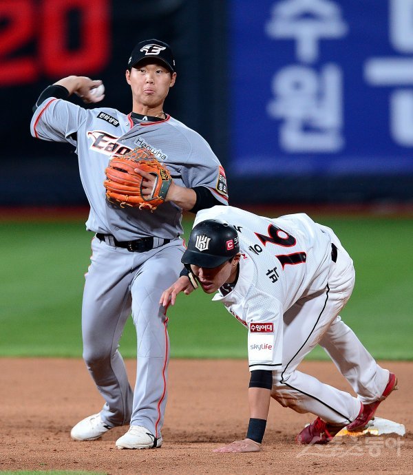 5회말 1사 1, 2루에서 kt 장성우의 내야 땅볼 때 한화 김현민이 1루 주자 박승욱을 2루에서 포스 아웃시킨 뒤 1루로 송구하고 있다.