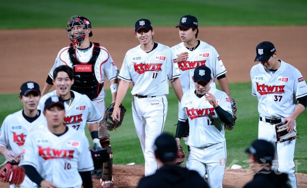 kt가 한화에 13-11로 승리한 뒤 선수들이 그라운드에서 기쁨을 나누고 있다.