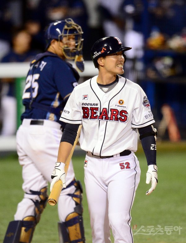 8회말 2사 1,2루 두산 김재호가 삼진 아웃을 당한 후 아쉬워하고 있다.