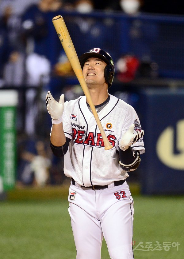 8회말 2사 1,2루 두산 김재호가 삼진 아웃을 당한 후 아쉬워하고 있다.