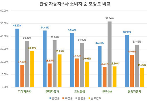 순호감도 2위는 현대자동차로 25.83%를 기록했다. 이어 르노삼성자동차 20.09%, 한국GM 16.30% 순이며, 쌍용자동차가 15.29%로 최하위를 기록했다.