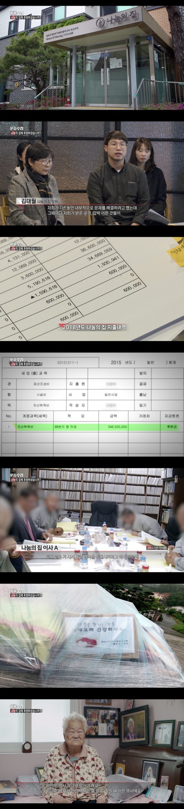 위안부 피해 할머니들의 요양시설로 알려진 나눔의 집에는 매월 5,6천여 명의 후원자들이 낸 후원금이 2억 원 가까이 들어온다. 이렇게 쌓인 나눔의 집 후원금은 2020년 4월까지 72억 원 가량. 하지만 2018년 나눔의 집 지출 내역을 살펴보면 국가 지원비 외에 의료비, 장례비 그리고 재활치료비 등에 단 한 푼도 쓰이지 않았다는 것을 알 수 있다. 몇몇의 직원들은 열악한 환경을 해결하기 위해서 내부에서 문제를 제기하기도 하고 해결하려고도 했지만 그때마다 돌아 온 것은 협박과 공격이었다고 한다.