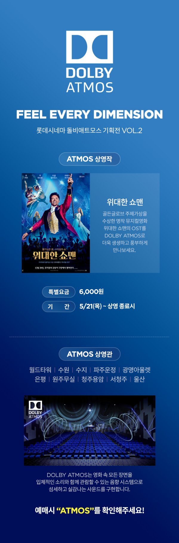 롯데시네마는 5월 21일부터 영화 ‘위대한 쇼맨’을 풍부한 사운드와 함께 즐길 수 있는 ‘돌비 애트모스 기획전 Vol.2’를 진행한다.