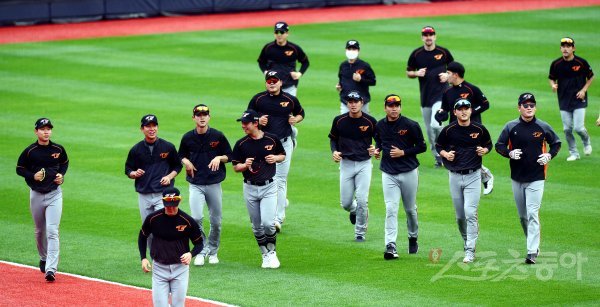 경기 전 한화 선수들이 외야에서 스트레칭을 마친 뒤 훈련을 준비하고 있다.