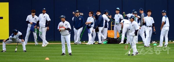 경기 전 NC 선수들이 외야에서 훈련 준비를 하고 있다.