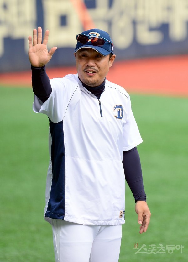 경기 전 NC 이호준 코치가 인사하고 있다.