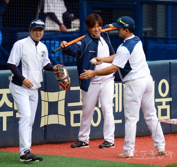 경기 전 NC 박석민이 긴 봉을 이용해 훈련을 하고 있다.