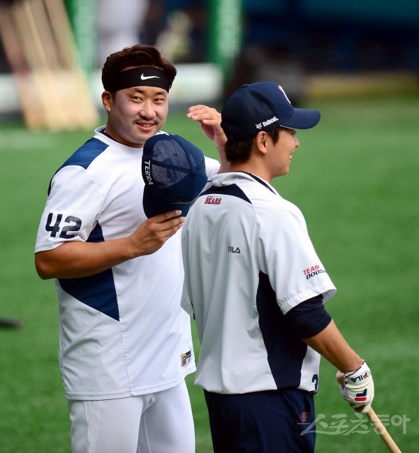 경기 전 NC 김태군과 두산 정수빈이 이야기를 나누고 있다.