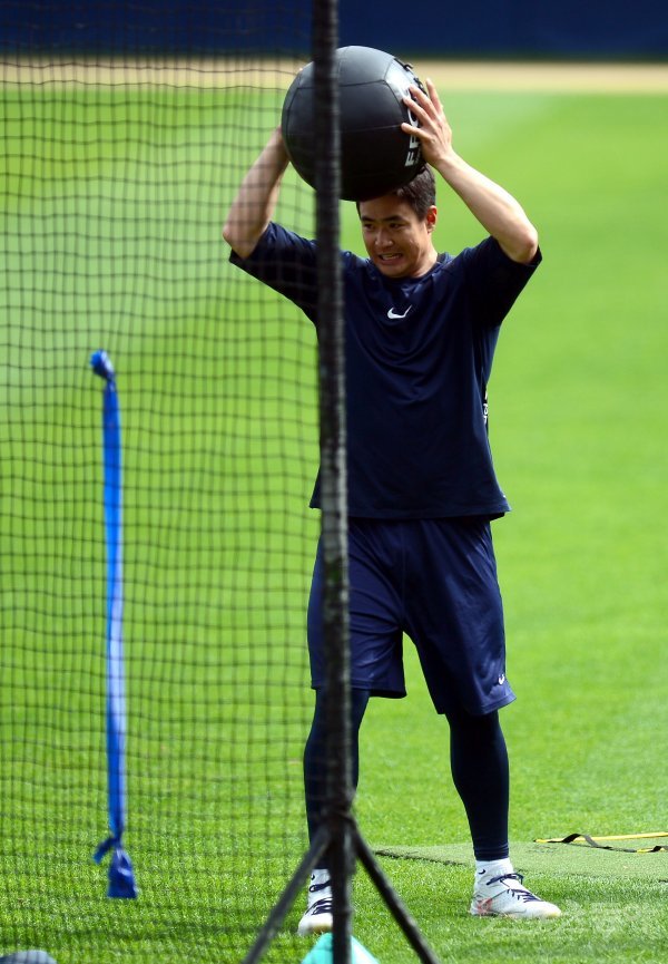 경기 전 두산 김재환이 메디신볼로 훈련을 하고 있다.
