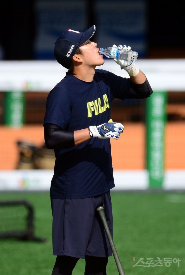 경기 전 두산 허경민이 훈련 중 물을 마시고 있다.