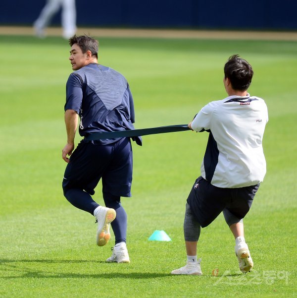 경기 전 두산 김재환이 훈련을 하고 있다.