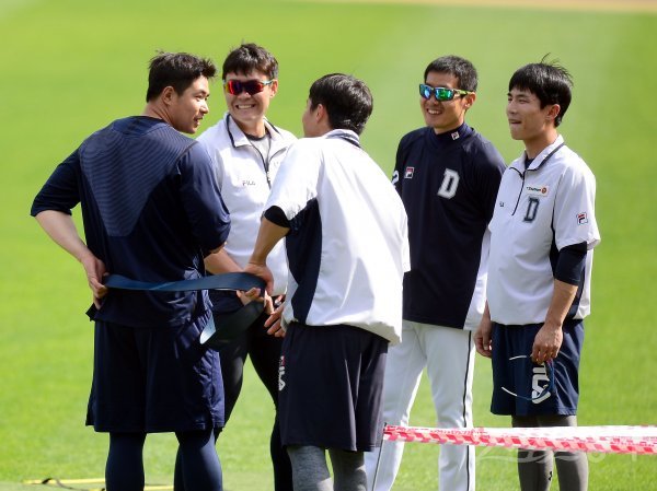 경기 전 두산 김재환이 훈련 준비를 하고 있다.