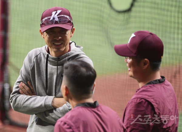 키움 손혁 감독이 경기에 앞서 진행된 훈련에서 코치진과 웃으며 이야기하고 있다.