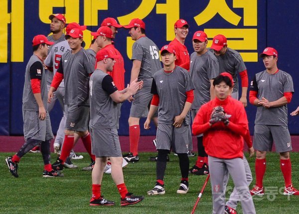 SK 로맥이 경기에 앞서 진행된 훈련 중 소리 지르며 동료들을 응원하고 있다.